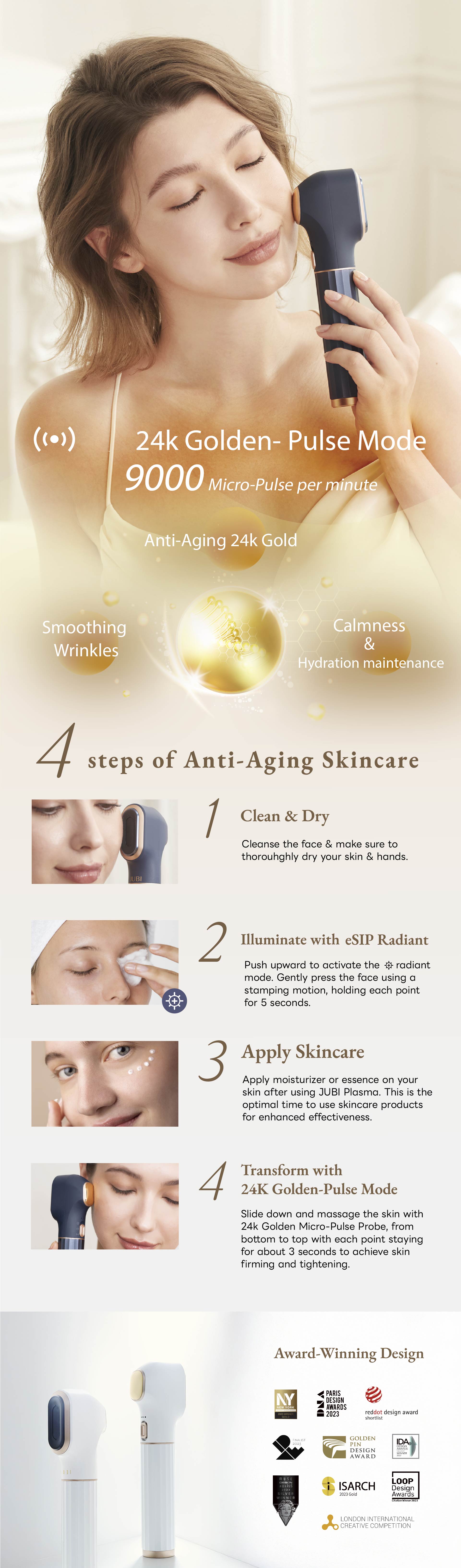 .Powered by proprietary eSIP cold plasma technology, Radiant Mode purifies, calms inflammation, and enhances skincare absorption, while Golden Pulse with a 24K gold-plated head soothes and deeply hydrates.