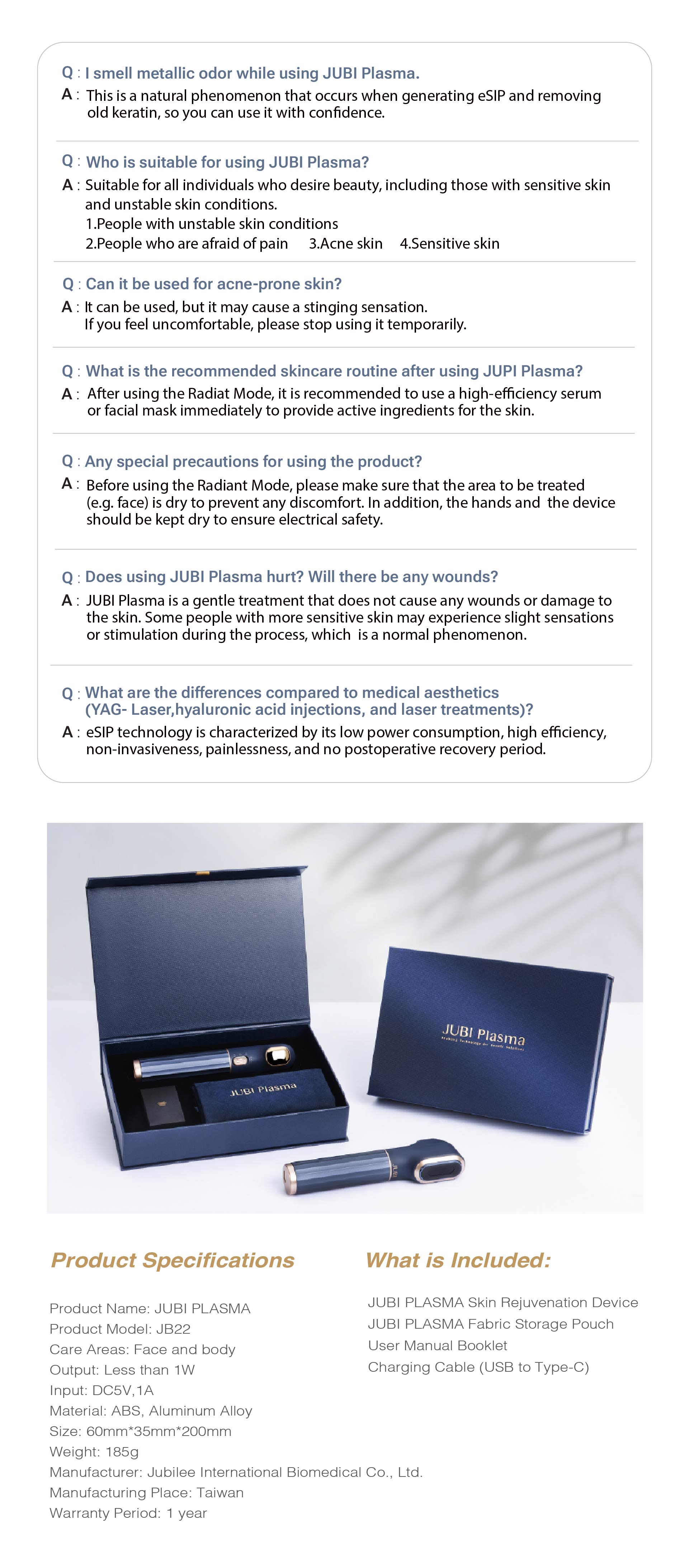 .JUBI Plasma is our flagship device, designed to target five key skin concerns—uneven texture, wrinkles, low moisture, excess oil, and blemishes—by working deep beneath the surface to restore skin health and radiance.