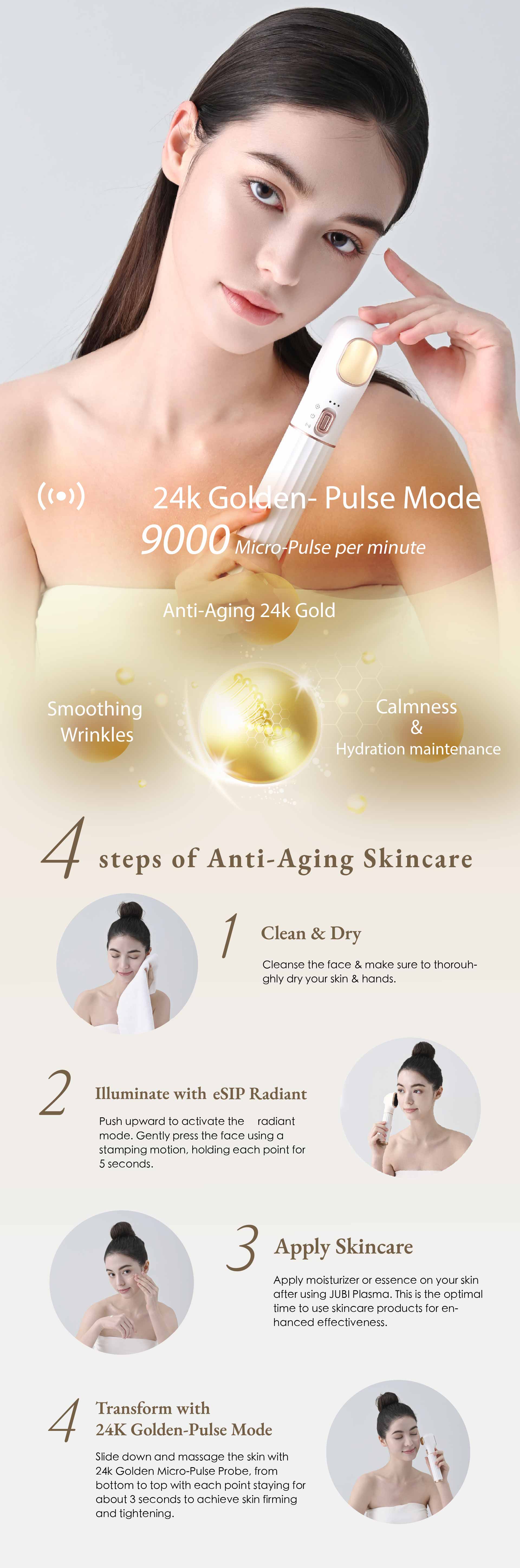 .Powered by proprietary eSIP cold plasma technology, Radiant Mode purifies, calms inflammation, and enhances skincare absorption, while Golden Pulse with a 24K gold-plated head soothes and deeply hydrates.